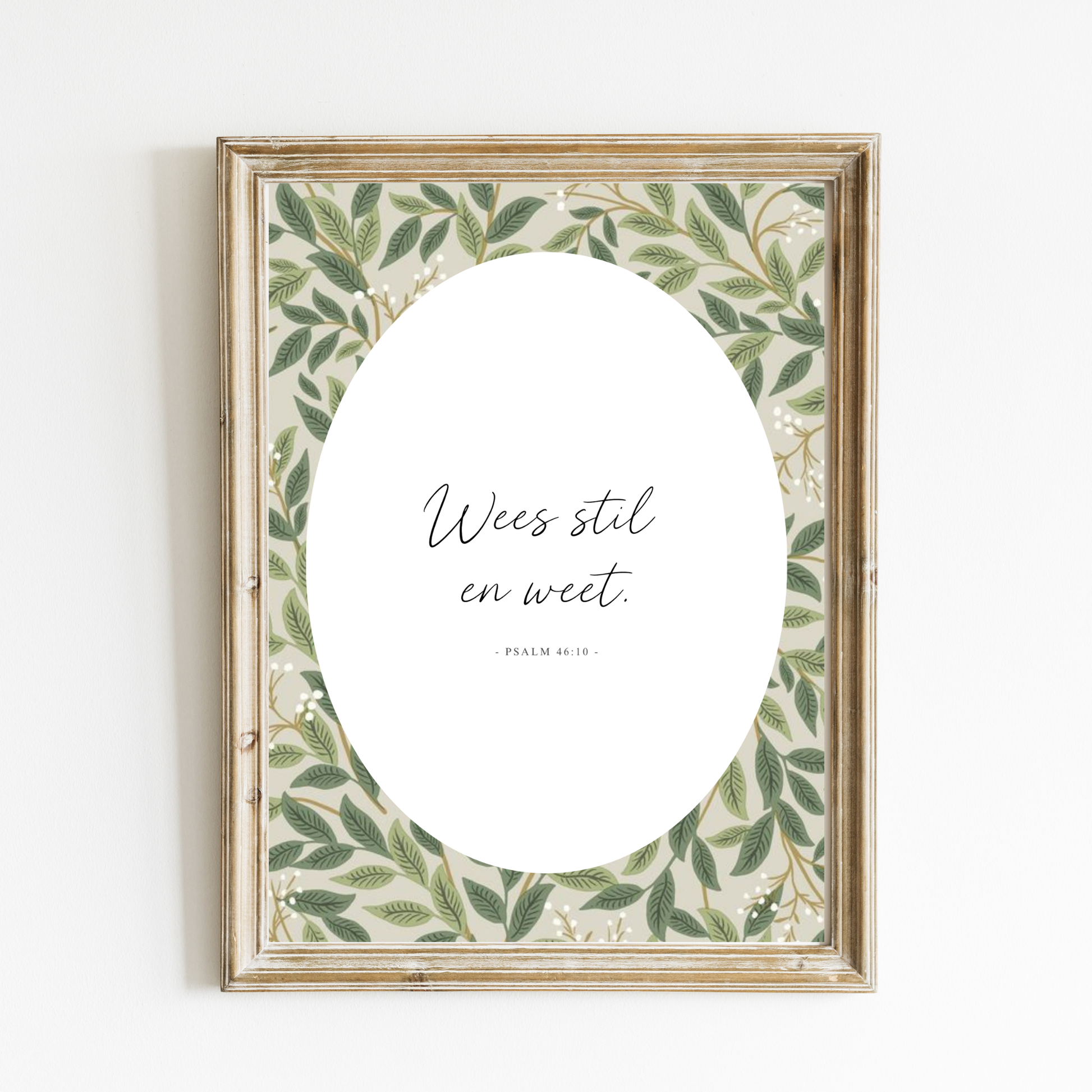 This A4 art print features the beautiful Afrikaans Scripture from Psalm 46:10, “Wees stil en weet.” Set within a soft botanical border of leafy green tones, this design creates a calm and peaceful atmosphere while gently reminding you to rest in God’s presence and sovereignty.